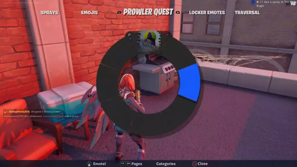 ただし、この特定のクエストでは、エモート バーからスプレー缶をスライドして選択する必要さえありません。デイリー ビューグルのエモート ボタンを押すだけで、プラウラー スプレー缶を使用できるプラウラー セクションが直接開きます。