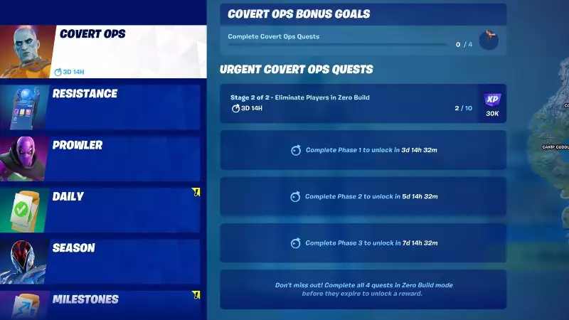 フェーズ 1 が正式に Fortnite でライブになると、タイマーが切れると全員が利用できなくなるため、プレイヤーは秘密作戦のステージを完了するのにあと 3 日しか与えられません。フェーズ 2 のロックを解除するには、Covert Ops クエストの最初のフェーズを完了する必要があるため、タスクを継続することが不可欠です。
