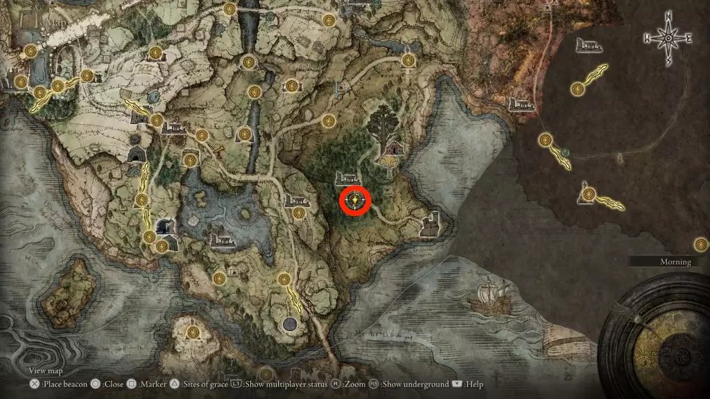 ラダハンの世話をしたら、上のスクリーンショットでマークされた場所に向かい、永遠の都ノクロンへの入り口を見つけます. Limgrave の Mistwood Grace サイトの南にあります。