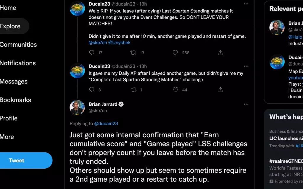 ジャラドはまた、試合が完全に終了しない限り、「累積スコアの獲得」と「プレイされたゲーム」の最後のスパルタン スタンディング チャレンジはカウントされないと述べました。特に LSS では、プレーヤーが試合を離れた後も XP とイベント チャレンジの進行状況を失わないことが明示的に言及されているため、これは奇妙です。