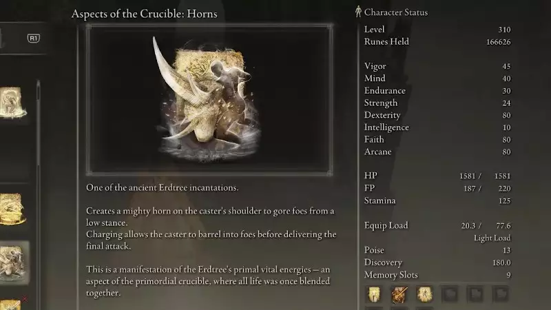 クルーシブルの側面:エルデン リングの角を使い始める前に、それを使用するための適切な武器が必要です。この動きは呪文であり、ホーンを使用するには聖印が必要です。封印がなければ何も始まらない.