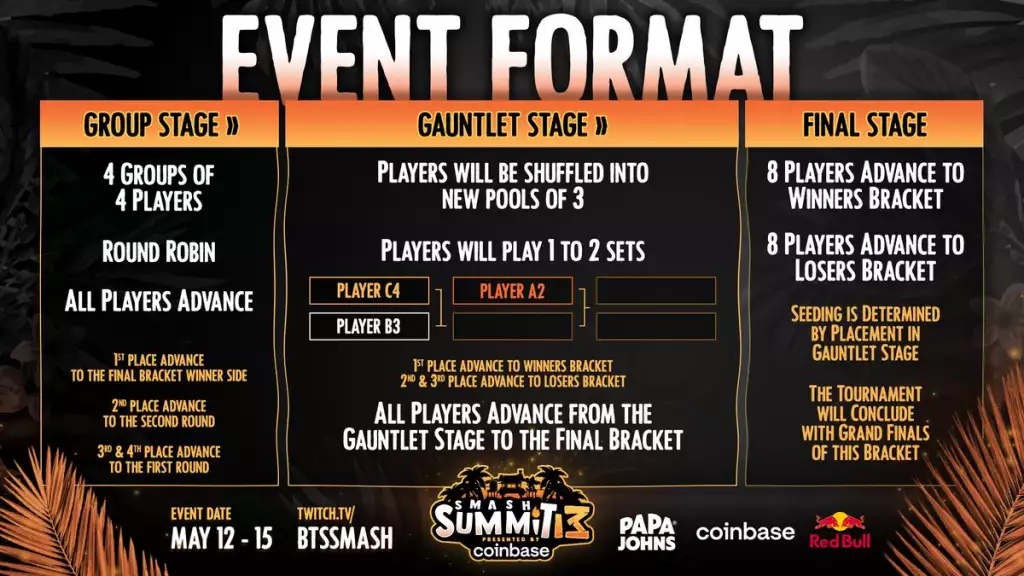 形式に関しては、最新の Ultimate および Melee Summits と同様のものに従い、ガントレット フェーズ中にプレーヤーの位置を決定する最初のラウンド ロビン グループ ステージを備えています。