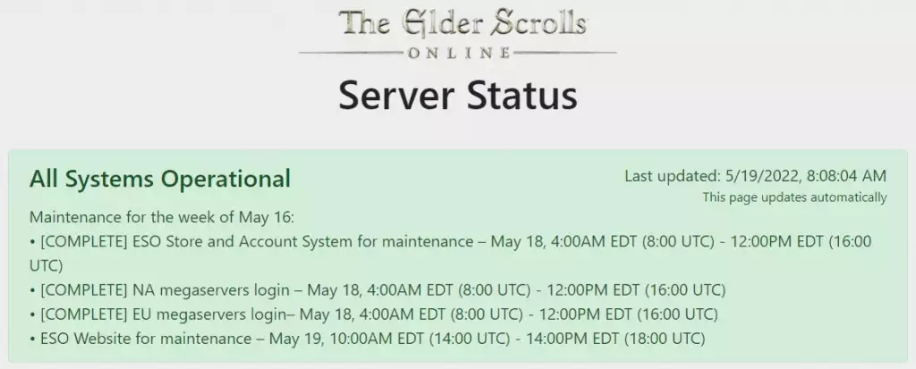 執筆時点では、エルダー スクロールズ オンライン サーバーはダウンしていません。ただし、これは一部またはすべての地域ですぐに変更される可能性があります。
