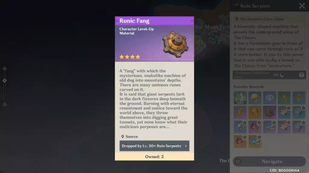 テイバットのリユエ地域にあるキャズムの地下鉱山エリアにある LVL 30 以上のルイン サーペント ボスを倒すと、ルーニック ファング キャラクター アセンション アイテムを入手できます。