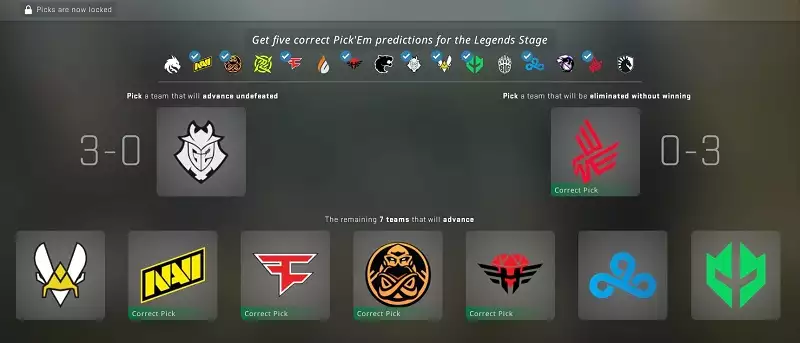 上の画像からわかるように、レジェンド ステージ Pick'Em の予測は的を射ており、PGL アントワープ メジャーでダイヤモンド イベント コインを争っています。