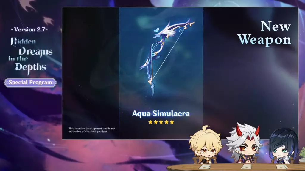 2.7 スペシャル プログラム ライブストリーム中に、HoYoverse は Aqua Simulacra の弓が Genshin Impact に到着する次の武器になることを発表しました。 Genshin Impact に登場する 2 つの武器のうちの 1 つとして、無料またはゲーム内のガチャ システムから入手できます。