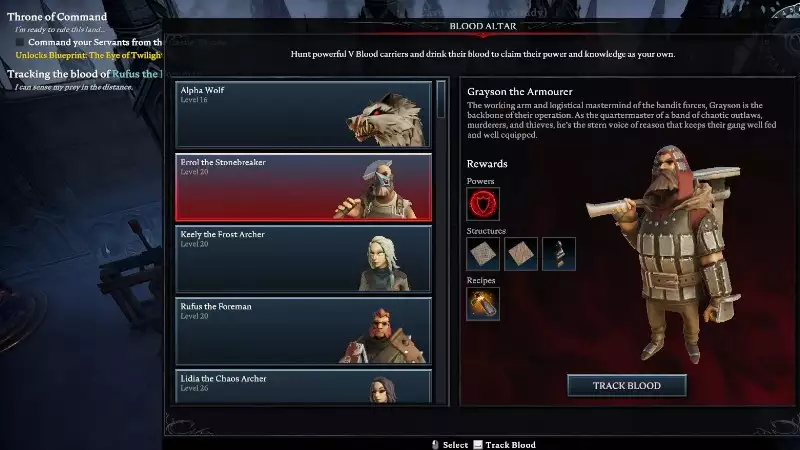 血の祭壇が操作されると、V Rising 内の血の運搬人またはボスのリストが表示されます。それぞれにレベルとそのキャラクターの説明があります。キャラクター カードの下に、血を追跡するか、先に進みたい場合は追跡を停止するオプションがあります。