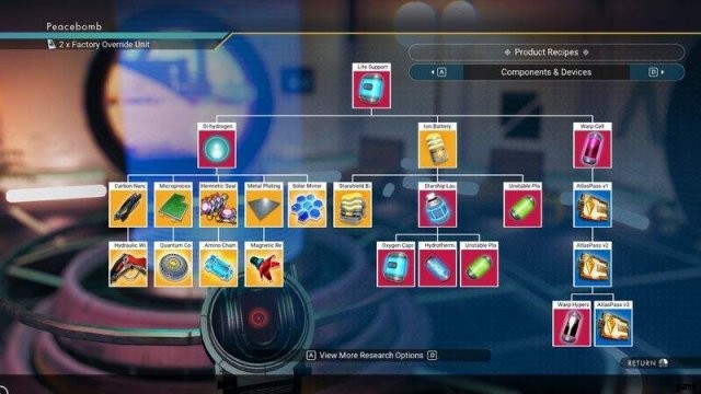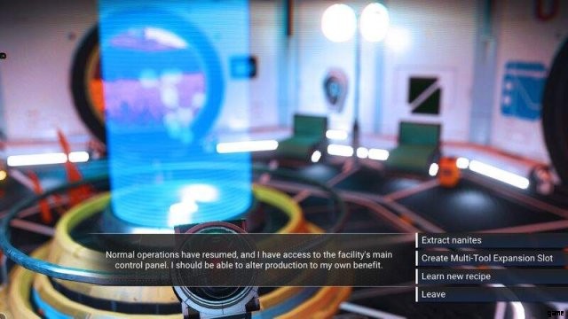 - 3.コンソールを見つけて有効にします。最終的に報酬として、Nanites、マルチツール拡張スロット、新しいレシピの学習の 3 つのオプションが得られます。アトラス パスを取得するには、[新しいレシピを学ぶ] を選択します。これにより、「ファクトリー オーバーライド ユニット」が得られます。