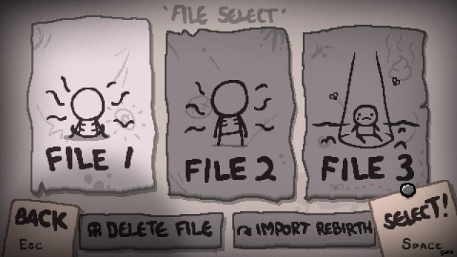 最初の 2 つのセーブは Afterbirth+ からの「インポート」で、最後の 1 つは空のセーブ (0%) です。