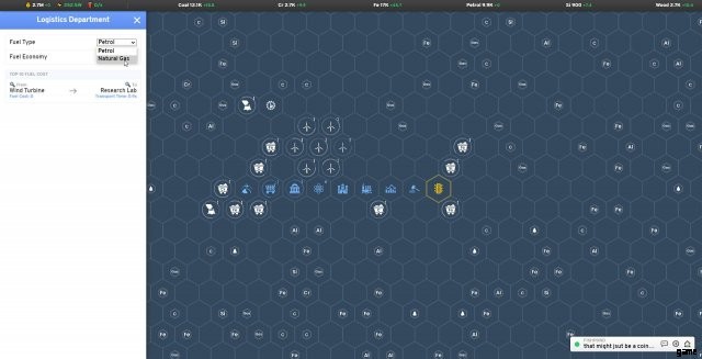 ゲームには現在、ガソリンと天然ガスの 2 種類の燃料があります。マップで利用できるものに基づいて、どちらを選択するかを決定する必要があります。燃料の種類は「物流センター」で変更できます(下記参照)。資源の輸送には燃料がかかるため、貯蔵庫に十分な燃料があることを常に確認する必要があります。そうしないと、経済が停止します。
