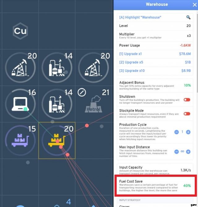 倉庫は、工場間の資源の輸送を支援するために使用できる建物です。現在工場にあるリソースを選択して、倉庫に送ることができます。倉庫の入力容量は、サイクルごとに倉庫に送信できるリソースの量ですが、出力容量は無制限です。リソースが倉庫に送られると、リソースを輸送するために必要な燃料の量に燃料節約ボーナスが適用されます。この割引は、倉庫のレベルに応じて調整されます。ただし、このボーナスは倉庫への輸送時にのみ適用され、倉庫からの輸送ではこのボーナスは付与されません。