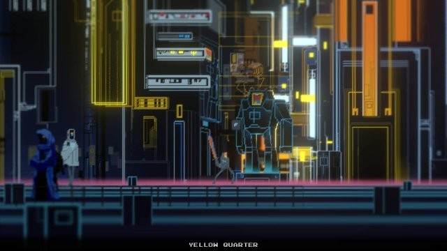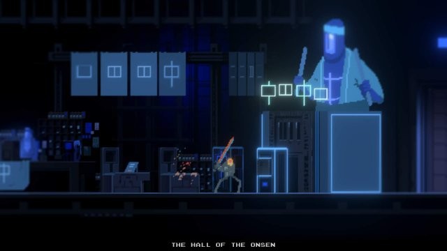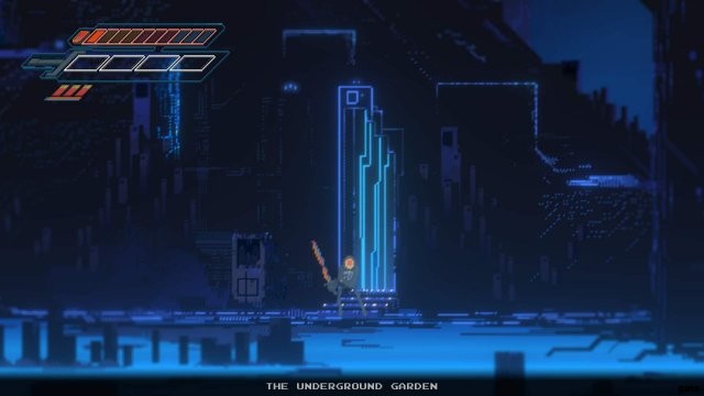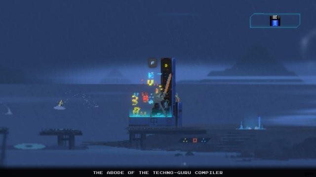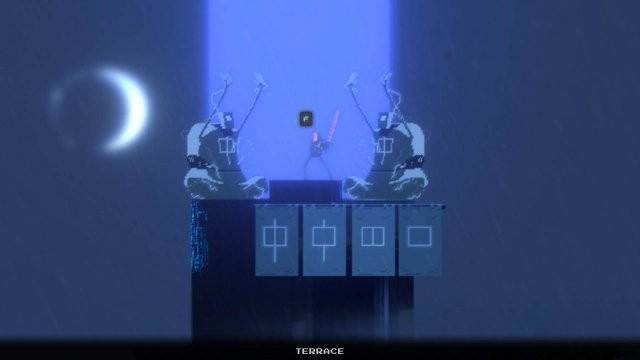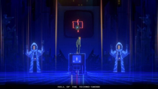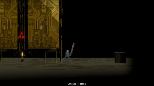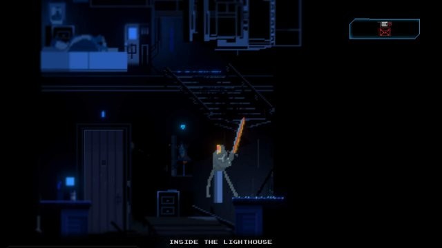 - プラットフォームに飛び乗り、J を連打して剣を取り出します。