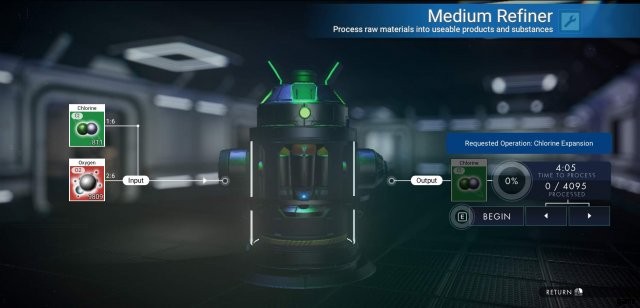 Medium Refiner が構築されたら、Clorine と Oxygen の両方を内部に配置します。酸素は塩素を膨張させ、リファイナーは入力よりも多くの塩素を生成します (これは基本的に塩素を乗算するだけです)。 4095 塩素 (最大出力数) を作るには、中型精製機で 4:05 分かかります。