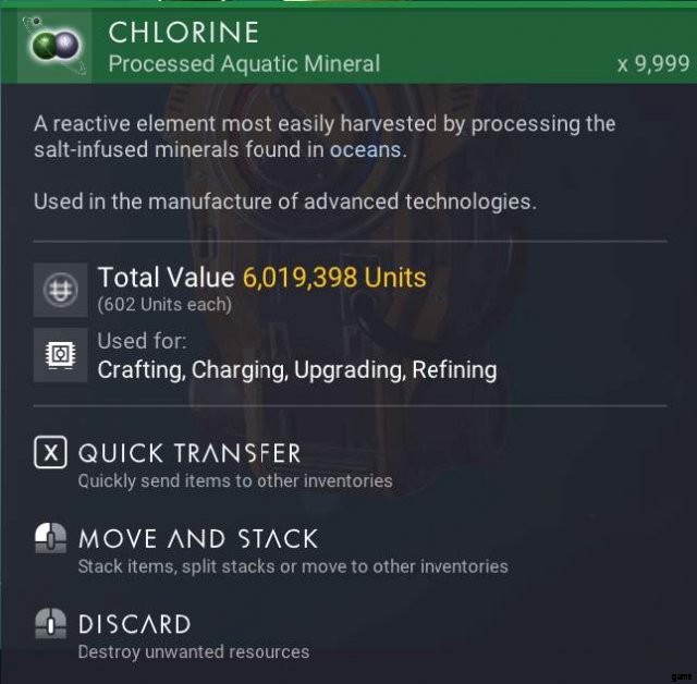 - 塩素は、塩の精製/惑星鉱物の採掘/宇宙ステーション トレード ターミナルによって得られます。