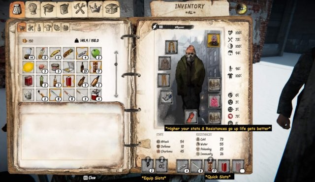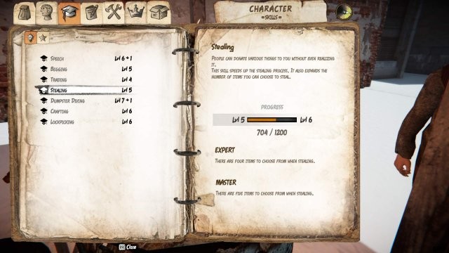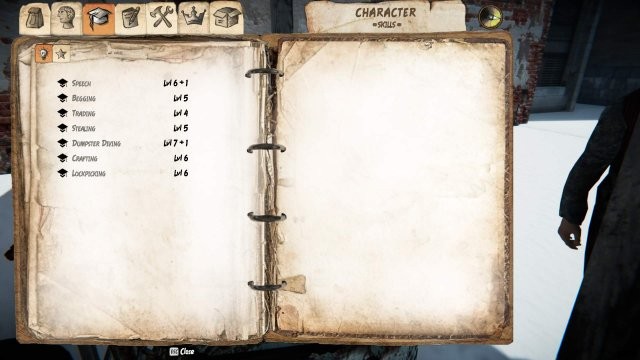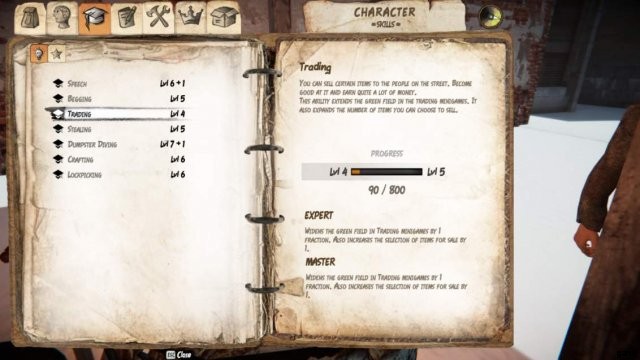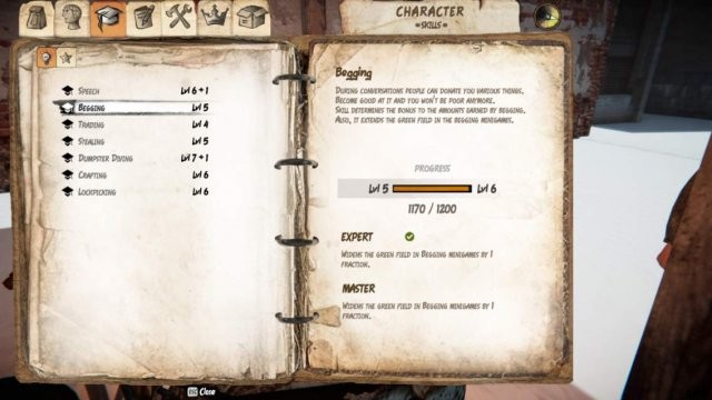 スタッツや衣服はほとんどないので、最初の良いヒントは、良い衣服、より多くのアイテムを入れるためのバッグ (良いアイテムには Hide Out Stash を使用) を見つけることです。ミニゲームのマーカー)、路上で人々と話す (物乞いミニゲームで現金を得るチャンスを増やすためにスピーチスキルを上げてください)。