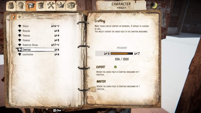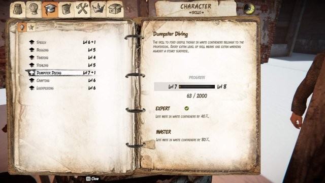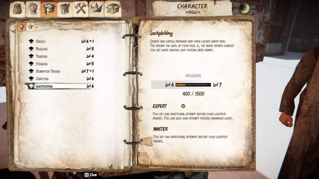 錠前ピッキング – 卑劣であることはクールなこともありますが、ロックされている可能性のあるドアやごみ箱を開くことができます (エキスパート スキルは錠前ピッキングが壊れる前に別のチャンスを与え、マスターは 2 回の試行を与えます!)