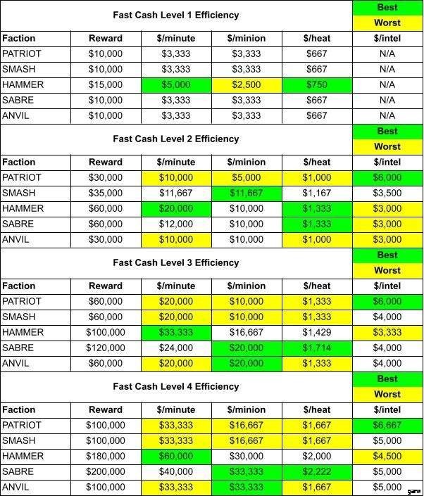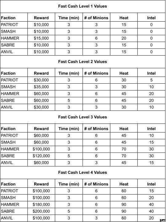- Fast Cash スキームは精彩を欠く傾向がありますが、PATRIOT ほど悪くはありません。レベル 2 のファスト キャッシュ スキームでは、2 人の警備員と 1 人の技術者が必要で、平均よりわずかに高いペイアウトが得られます。レベル 3 と 4 のファスト キャッシュ スキームには、組織のレベルの 4 つのマッスル ミニオンと 2 つのサイエンス ミニオンが必要です。