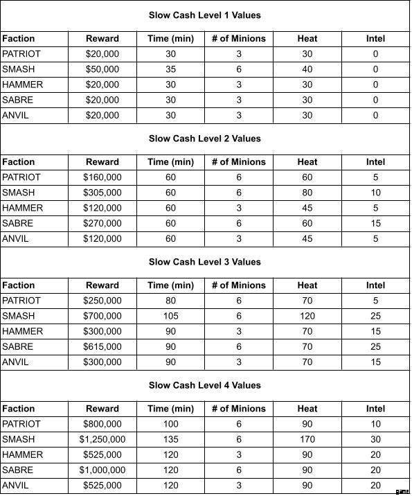 これらのスキームは、わずかな金額の資金を迅速に生成します (3 ~ 5 分)。達成するには筋肉のミニオンが必要になる傾向があり、世界地図上でドル記号の付いたオレンジ色の盾で表されます。これらのミッションは、初期のゲームマネーに最も役立ち、後で地域を焼き尽くして、ロックダウンのリセットのために熱を最大化するのに役立ちます.