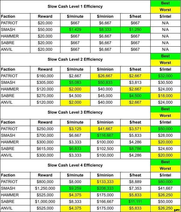 - HAMMER は手っ取り早くキャッシュを増やしたい場合に最適な場所ですが、非常に高額な情報要件と組織レベルの 6 体のマッスル ミニオンが必要です。これらのスキームはまた、非常に熱にやさしくないです。スロー キャッシュのキャッシュ フロー率は最悪ですが、適度なインテリジェンス要件で達成するのに 3 人のサイエンス ミニオンしか必要ないという利点があります。