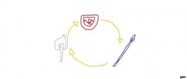基本的にじゃんけんで、剣の戦いに勝つには、敵は通常の赤を使用し、敵は青を使用し、敵は通常の赤を使用します