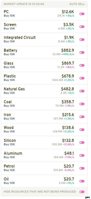 Having foresight about when you plan to liquidate and reset are important for market trading. A good strategy during the hours (or days) leading up to reset is to save up cash and wait for a product priced under it’s typical market valuation. Then, buy as great a volume of the product as you can (using saved cash), and when there’s an upturn in the market, reset using your inflated market cap or autosell the product for profits is the stock rating is unfavourable to reset at that time. This strategy is good at any point in progression, not just before reset, but keep in mind that it’s most beneficial in the later stages when saving cash makes more sense than spending it on upgrading your production.