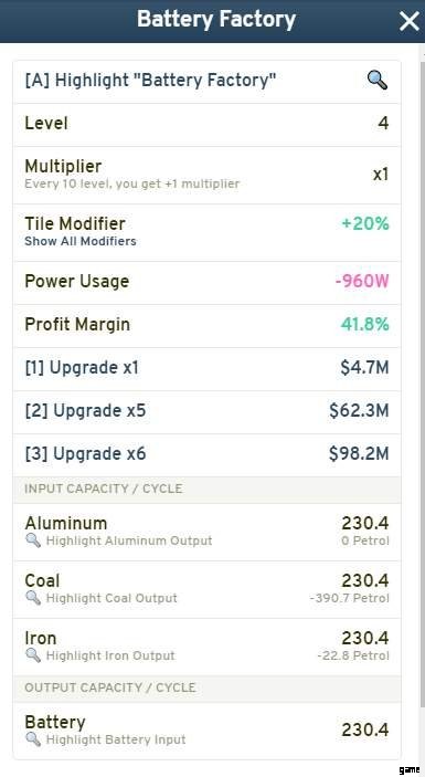 この例では、バッテリー工場は 230.4 個のバッテリーを生産するために 230.4 個のアルミニウム、石炭、および鉄を消費しています。各アイテムの価格は、最初のスクリーンショットに表示されています。 (上) 230.4 個のバッテリーを生産するための総コスト (トレード センターからリソースを購入した場合) は $143,400.96 です。