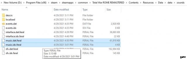 Total War ROME REMASTEREDContentsResourcesDatadatasounds に移動して、music.idx.feral と music.dat.feral の 2 つのファイルを探します。