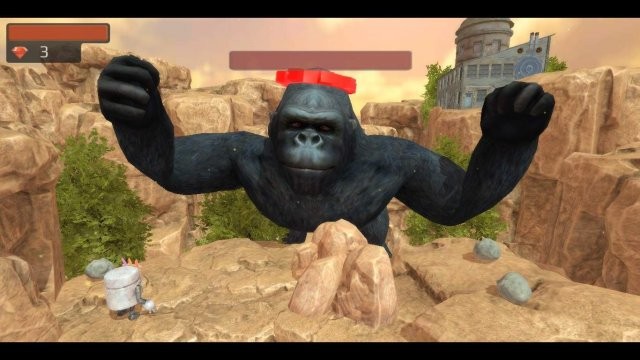 山から落ちてくる岩を取り、真ん中に行きます ジャイアントゴリラボスを小麦粉の頭に投げて、左または右に走ります。