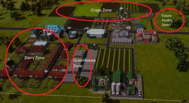 エリアを配置する「ゾーン」を決定します。 「家畜ゾーン」は明らかに南西の角にあるはずです。そこに 2 つのスターターの牛舎があるからです。その地域にすべての家畜を建てることを計画し、乳製品工場を近くに置いてください。飼料作物、販売作物、温室、および製造用の「ゾーン」を用意します。建物やフィールドをランダムに散らばらせると、長期的にははるかに複雑になります.