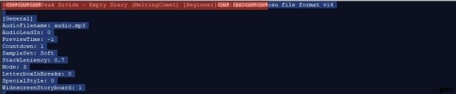 - .osu ファイルからすべてのテキストを .dat ファイルにコピーして戻します。osu ファイル形式 v14 の先頭と最後の行の直前以外のデータを上書きしないように注意してください。