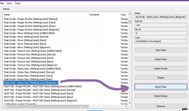 - UBAE を保存して開き、resources.assets を開き、[未加工のインポート] をクリックします。ファイルを保存します (UABE は保存できないと言うかもしれません。別の名前で保存し、名前を変更するだけです)。