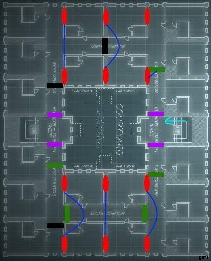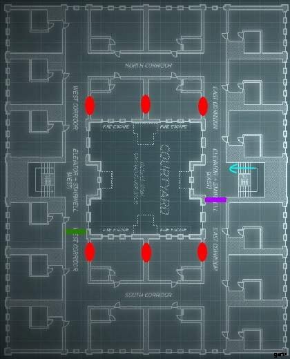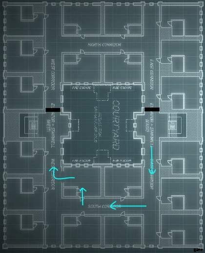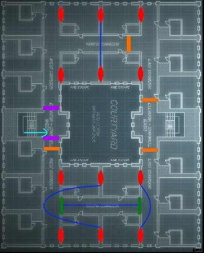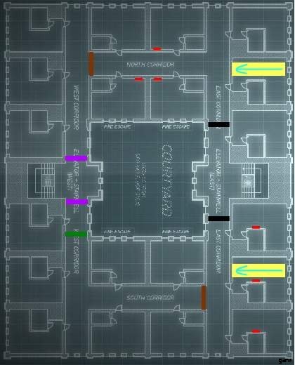 C4でドアを吹き飛ばした後、強盗は階段を上ることを余儀なくされ、階段の左側または右側にある封鎖に遭遇します.これにより、強盗はこの封鎖とは反対の道を歩むことになります。一方向に強制されるということは、この実行では反対方向に完全にアクセスできないことを意味します。この同じ動作が 2 階と 3 階で繰り返されますが、これら 2 つのフロアは隠れた接続を共有しています。 2階で左(計画では南)に行かなければならないということは、3階の左側(北)に行かなければならず、2階(北)で右に行くと必ず上に行かなければならないということです。 3 階の右側 (南側) へのスロープ。