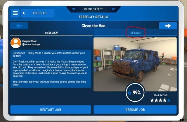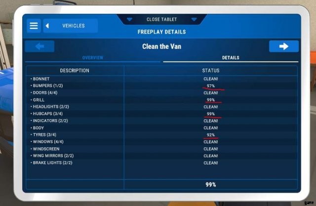 詳細タブには、マップ内のすべての部分のリストと、それらがどれだけきれいかのパーセンテージが表示されます。