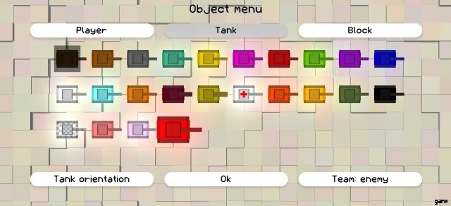 さまざまなタンクをクリックして、配置するタンクを選択できます。各タンクにカーソルを合わせると、その機能が表示されます。次に、「タンクの向き」ボタンで最初のタンクの向きを選択できます。 「チーム」ボタンを使用して、タンクを配置するチームを選択することもできます。戦車はチームに属していない戦車とのみ戦うため、この機能を使用して、プレイヤーが戦うのを助けるコンピューター制御の仲間を配置できます。