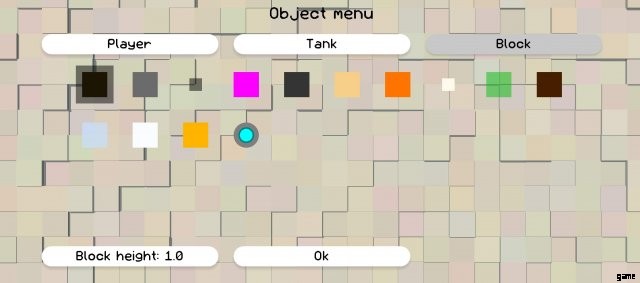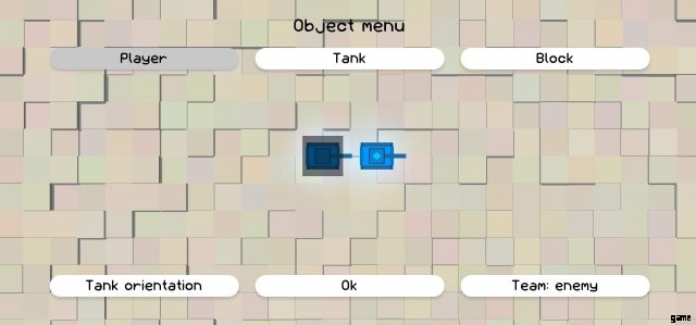 メニューの上部には、「プレイヤー」、「タンク」、「ブロック」の 3 つのボタンがあります。これらのボタンを使用すると、プレイヤーのスポーン ポイントの編集、コンピューター制御の戦車の配置、ブロックの配置を切り替えることができます。次のセクションでは、これらの各ボタン タブについて詳しく説明します。