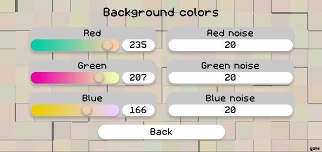 ここで変更できることは 2 つあります。メインの背景色とノイズ - レベルに追加される色の「ランダム性」。ノイズ値は 255 からカラー値を差し引いた値までしか変化しないため、赤の値が 200 の場合、赤のノイズは 55 までしか変化しません。通常、高いノイズ値は邪魔になる可能性があるため、使用しないことをお勧めします。ゲームプレイの邪魔にならないように、レベルのテーマにうまく合い、暴力的すぎない色を選んでください。