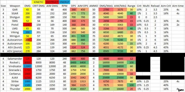 これが私が作った大まかな武器統計表です。未完成で、いつか更新するかもしれませんが、現状でも基本的な情報を提供できます。武器を手動で狙うと、4 秒後にクリティカル率が 15% 増加することに注意してください。怠け者ではなく、常にオーバーウォッチに頼るのではなく、できる限りそれを利用するようにしてください。オーバーウォッチもエネルギーを蓄えます。