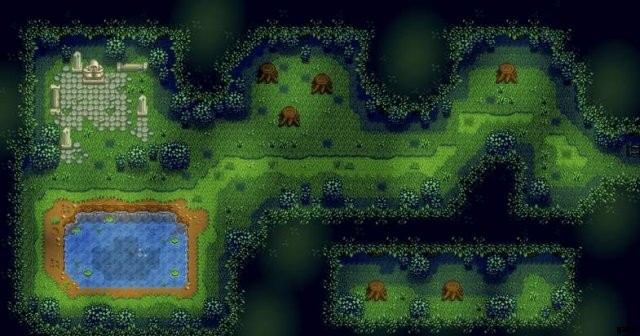 先に進むと、森の左上に小さな聖域があり、その下に小さな池があります.その近くの葉を通り抜けることでアクセスできる、さらに 2 つの丸太を保持するエリアもあります。