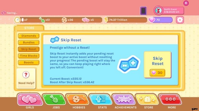 これは待機ゲームです。女の子へのプレゼントやデートをする余裕がない場合は、できるまでしばらく待つことができます。何かを購入できるようになるまでに 1 週間以上かかる場合、または単に待つよりも時間がかかる場合は、ソフト リセットを行って乗数を増やすのに適した時期かもしれません。