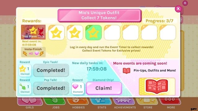 もう 1 つの例外は、ダリアに関するものです。この女の子の費用は 15 ドルで、いくつかのレベルでは、一定数の仕事や趣味を金メッキする必要があります。このキャラクターには 50 個のダイヤモンドが付属しており、新しい関係レベルに到達するたびにかなりの量が得られるため、これらの金メッキは進歩するために必要なだけでなく、自分自身の支払いにもなります.趣味に関しては、どれも他のものほど価値がありませんが、スケッチ/優しさ、自警行為/ミステリアス、スカイダイビング/ラッキーについて言及します。合理的に期待できるよりもはるか前に綾乃と恋人に到達するには、これらで60が必要です。これらで60をヒットします。愛の仕事を引き受けるために必要な統計も価値のあるオプションです。