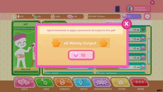 このゲームに多額のお金を投資する予定がある場合は、すべての仕事と趣味を金メッキすることで、最大のスピード ブーストと組み合わせて、お金の生産量と趣味の速度を向上させることができます。これには 280 ダイヤモンド、つまり 20 ドルかかります。バンドルに含まれるジョブを金メッキするには、さらに 20 ダイヤモンドが必要です。これは、無料のダイヤモンドまたはさらに 2 ドルで行うことができます。