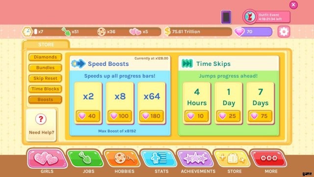 残念ながら、このゲームは勝つためにわずかに支払う必要があります。すべての女の子やこのゲームのエンディングを見たい場合は、少額の現金を没収する必要があります。スピード ブーストなしでゲームに勝つには天文学的な時間がかかりますが、x8192 乗数はそれを可能にします。