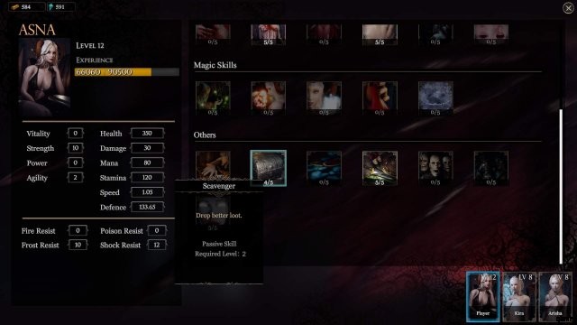 “Scavenger” basically just enhances the gold-xp loop. The way loot drops work right now in the game, you’re really not going to ever find anything worth equipping, even on a low level companion. What taking scavenger to 5/5 does then, is increase the amount and type of loot that drops. I realize the tool tip simply says “drop better loot,” but I definitely notice a very significant increase in both amount and type when maxed. Before, you will see a bunch of silver cups (64-ish gold) and a bunch of lingerie, (18 gold…) now you will see more weapons and armor, most of which sell for at least a few hundred each.