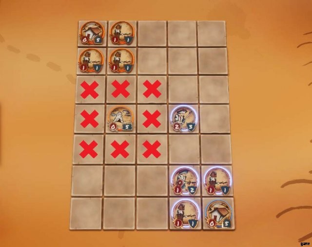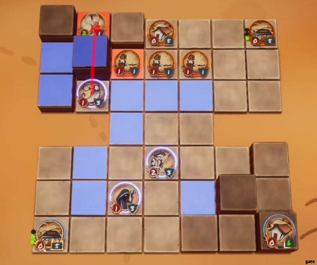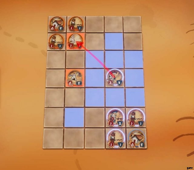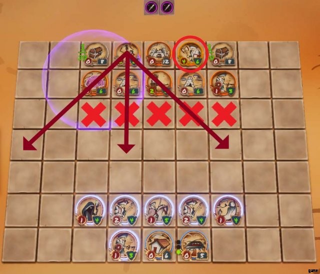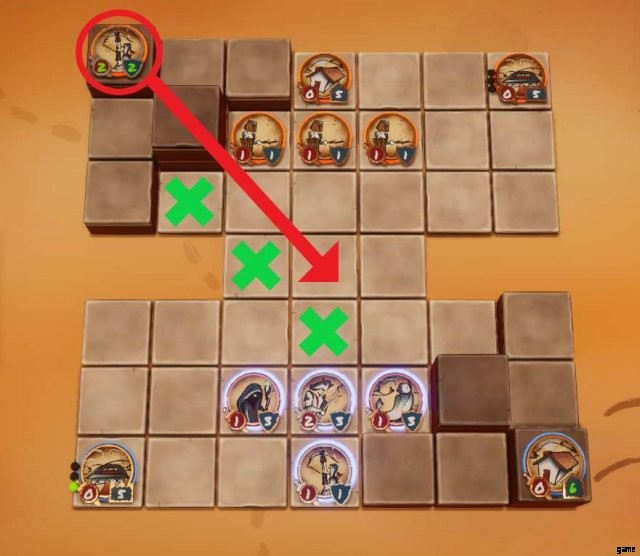ただし、タワーとは異なり、アーチャーは自由に移動できます。これは、単にそれを回避することが必ずしも選択肢ではないことを意味します。代わりに、アーチャーを倒す方法を見つける必要がありますが、すぐ隣に移動できない場合は、緑色でマークされたような中間スペースに移動する必要があります.これらのスペースは射手からすぐに安全であり、後で攻撃するためのステージングエリアとして使用できます.また、射手がさまざまな高さからどれだけのダメージを与えることができるかに注意し、スカウトやビッグ グラントなど、1 ターン生き残るユニットで移動することも重要です。たとえば、ここに示されている動きを行うと、スカウトは生きたままになり、射手がどこに移動しても、次のターンに射手を破壊することができます.
