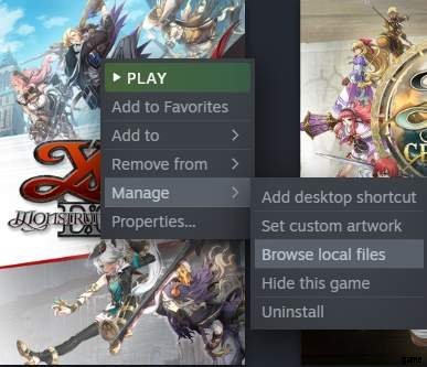 - Ys IX Monstrum Nox フォルダを開きます。このフォルダに移動する最も簡単な方法は、Steam ライブラリで Ys IX を右クリックし、[ローカル ファイルの参照] をクリックすることです。