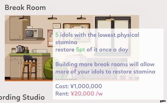 - そうは言っても、アイドルの給料は、家賃やスタッフの給料などと比較して大きな支出の 1 つではありません。そのため、アイドルを働かせる方法がある場合は、恥ずかしがらずにアイドルをさらに募集してください (覚えておいてください:すべての5 人のアイドルをリクルートして、休憩室を追加してください!)