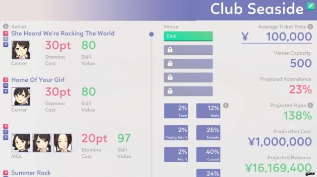 - コンサートを設定し、チケットを 100,000 に設定して 1000 ~ 1500 万の利益を得るか、10000 のように設定して、ファンを怒らせることなく 500 万の利益と 100% の出席を得ることができます。