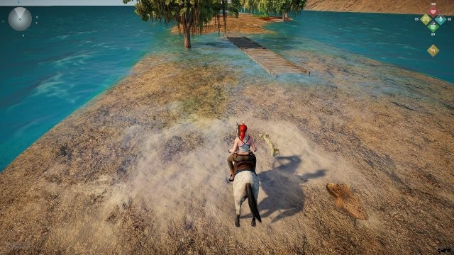 木製の歩道が見えるまで陸橋を進みます。恐竜の骨は、歩道に到達する直前の白い砂のパッチに横たわっています (このショットの馬の頭の影のすぐそば)。