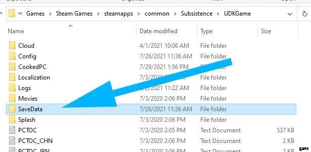 - まず、既存のセーブをバックアップします。 Subsistence ディレクトリに移動し、次の手順で既存の SaveData フォルダーのコピーを作成します。