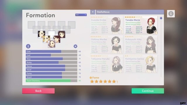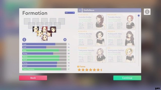 アイドルの 8 つのステータスは、ケミストリーとともにフォーメーションに結合され、グループ ステータスになります。正確な式は完全には明らかではありませんが、基本的には、フォーメーションの最前線に近い女の子のスキルを優先して重み付けされた、グループのスキルの平均です.そのため、スキルの高い女の子をフォーメーションの前に配置することは、フォーメーションの後ろに配置するよりも、グループの統計にはるかに大きな影響を与えます.統計は、選択したアイドルだけでなく、グループ全体の統計に基づいているため、できるだけ多くのアイドルを取得したくないのもこのためです。